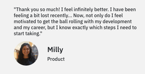 With that background in mind — that there were others like her in her industry — she learned that she was already performing above and beyond. So Merit connected her to another Coach: Jen Hau, VP of Product at Troops, and they strategized how Milly could get a promotion.
