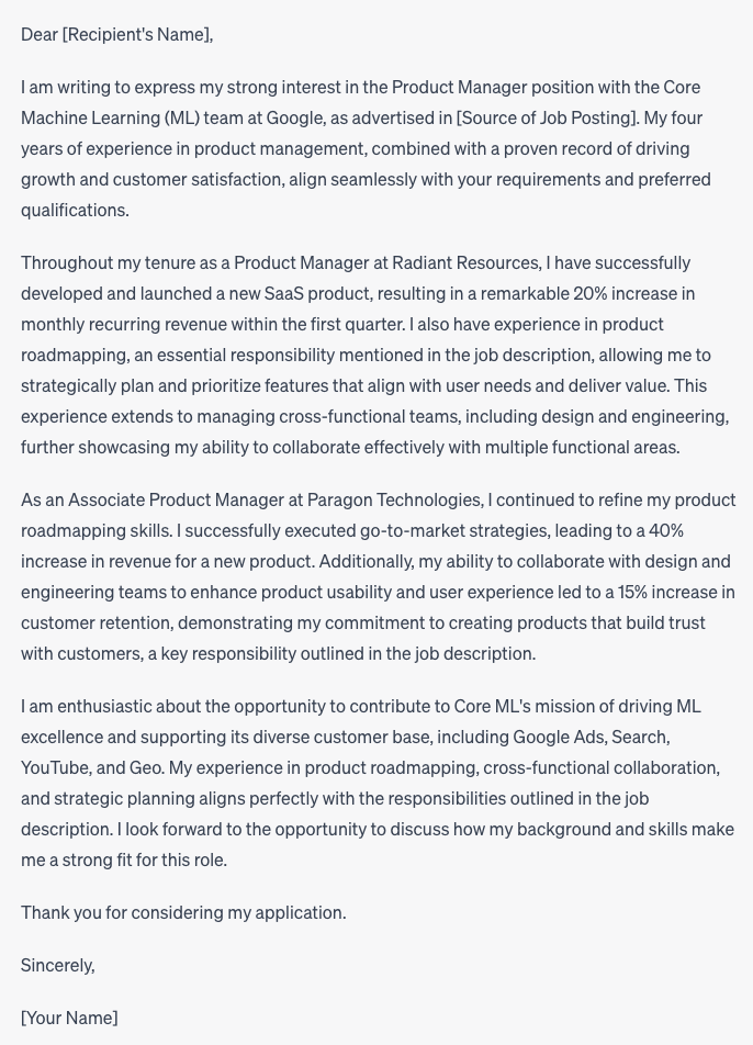 Here is an example of a cover letter Chat GPT generated via the prompt above, using an open product manager job description at Google and a sample resume from an entry-level product manager: