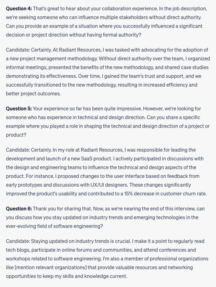 Here are a couple of the questions and answers Chat GPT generated, using the same job description and resume referenced above: