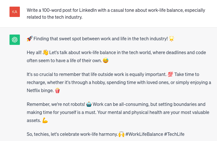 Using the same principles above, generative AI can help you craft follow-up and thank-you emails after interviews, ensuring your post-interview communication is well-received and leaves a positive impression. Remember that you can also ask Chat GPT to change the tone of your messages and outreach from “formal,” to “casual” and anywhere in-between. Use these additional capabilities to ensure a certain level of accuracy and personalization when connecting with people virtually. While you are optimizing the process, it’s important to remember that everyone on the receiving end is a real person — not a data point.